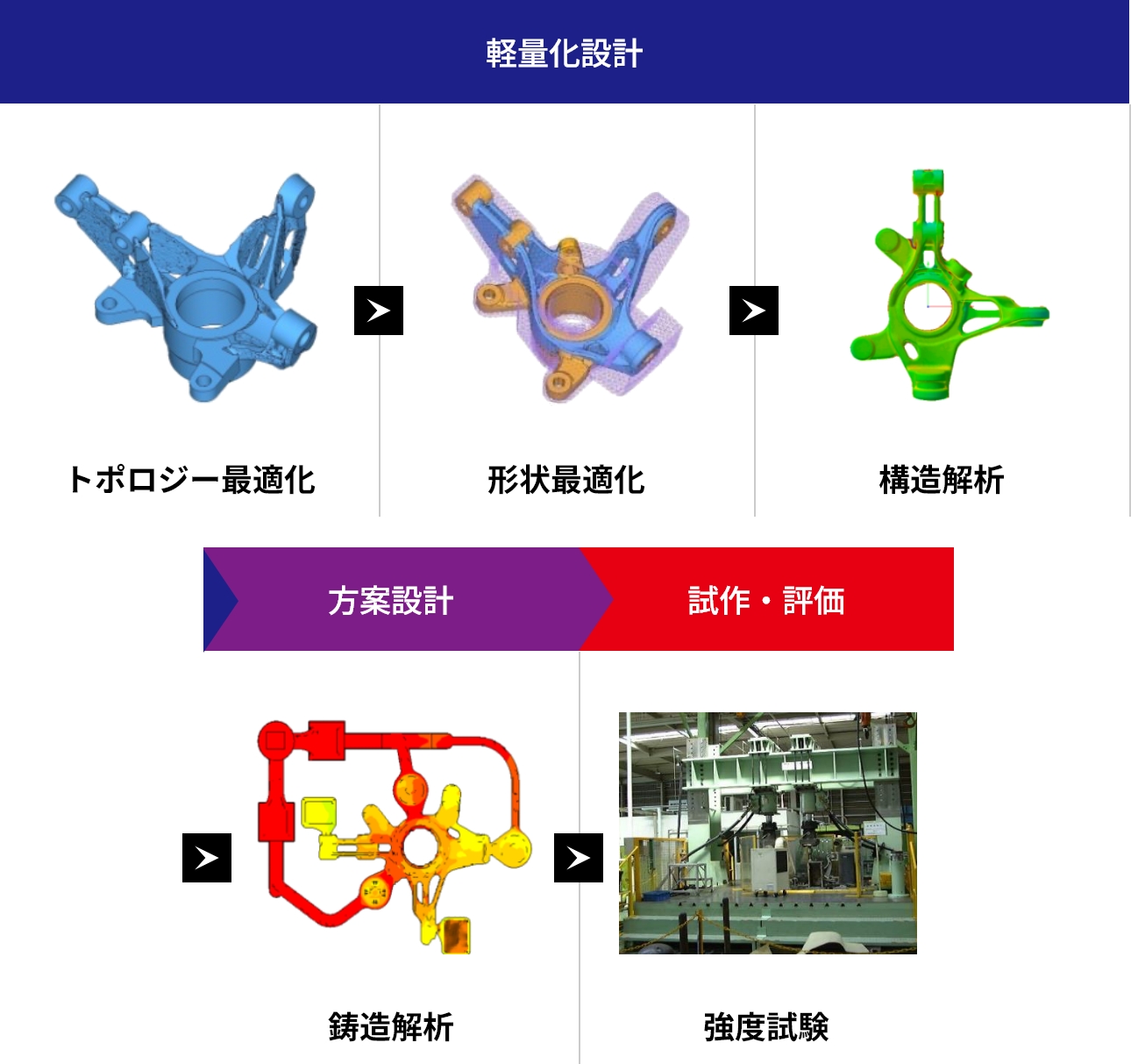 [プロセス] [材料・分析] [設計・解析] [実体評価]の4つのコアコンピタンス技術を駆使し、新製品・新技術を創出します。